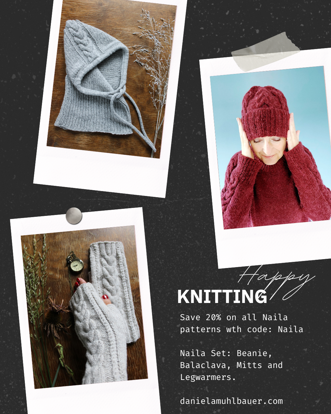 20% auf alle Naila Anleitungen (Beanie, Balaclava, Stulpen, Stirnband) mit Code: Naila